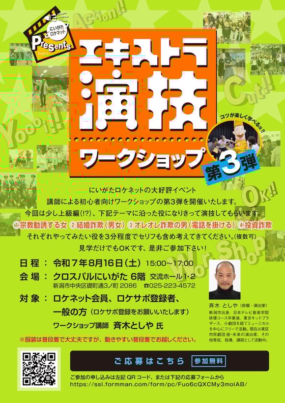 にいがたロケネットの演技ワークショップ第3弾が、2025年8月16日(土)に新潟市中央区のクロスパルにいがたにて開催されました。 今回は、事前に(1)宗教勧誘する女 (2)結婚詐欺(男女) (3)オレオレ詐欺の男(電話を掛ける) (4)投資詐欺 を役になりきって演じてもらうという課題を出していました。...