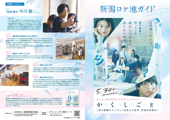 2024年夏に新潟市でロケされた映画『か「」く「」し「」ご「」と「』(2025年5月30日公開)のロケ地マップが完成しました。 掲載のロケ地 ・県立新潟商業高校 ・新潟第一高校 ・どっぺり坂 ・関屋浜 ・上古町商店街 中川駿監督のインタビューも掲載。 ぜひ、ロケ地マップを片手に新潟市内を散策してみてください。...