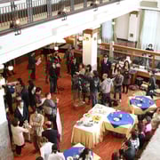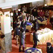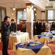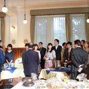 続くレセプションは、新潟市歴史博物館みなとぴあ内のレストランで開催。昭和初期に建てられた銀行を移築したここの建物は、石造りの重厚な洋館で映画「万能鑑定士Q−モナ・リザの瞳」のロケ地にもなりました。余興では古町芸妓(ふるまちげいぎ)による唄や舞も披露され、華やかな雰囲気に包まれました。