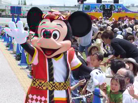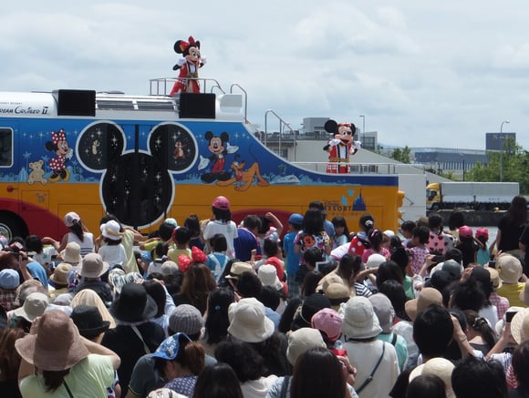 午前と午後の2回のショーで、ミッキー、ミニーと犬のプルートがディズニーバスに乗ってわざわざ会いに来てくれたということで、子どもたちは大喜び。「おんどこどん!ミッキー音頭」は東京ディズニーランドで今年開催するスペシャルイベント「ディズニー夏祭り」の新しい盆踊り。