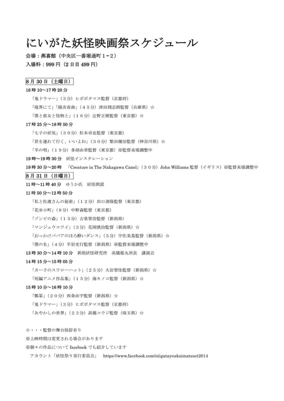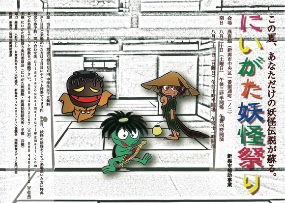 「にいがた妖怪祭り」なる面妖なイベントが夏休み最後の8月30日(土)、31日(日)に新潟市中央区の白山公園内「燕喜館」で開かれます。妖怪をテーマにした映画上映や、新潟市内の若手アーティストによる妖怪をテーマにした作品の展示、地元妖怪研究家による講演会など妖怪が盛りだくさん。