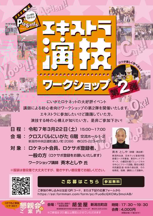 今回は、懇親会も企画しました。新潟で撮影された映画の話、撮影現場での話などなど語りあいましょう!